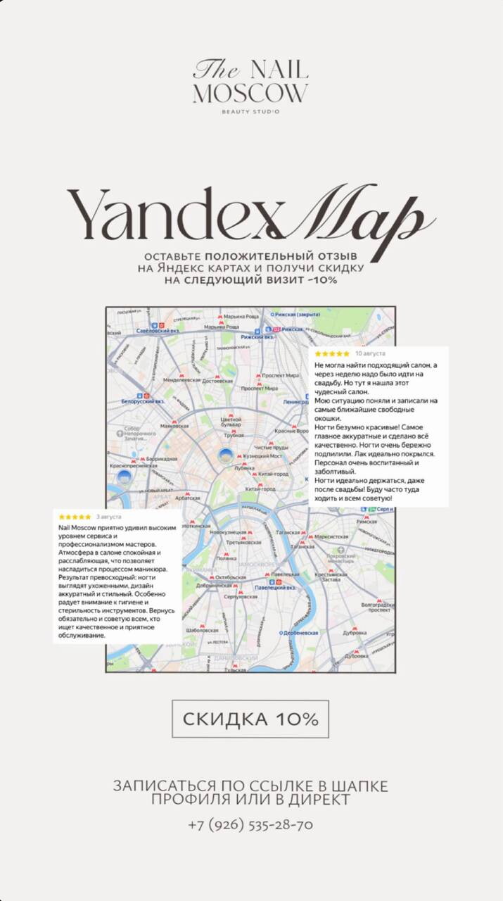 Вам все еще кажется, будто салоны красоты - странный каприз и ненужная трата денег? Посетите студию красоты Nail Moscow - и вы поймете, что это не так! Высокий профессионализм наших парикмахеров, визажистов и nail-мастеров не только обеспечит вам уровень ухода, недостижимый в домашних условиях, но также даст возможность действительно преобразиться, найдя себя в новом стиле. У нас вы забудете о стрессах будней и испытаете королевский уровень заботы, который никого не оставит равнодушным!